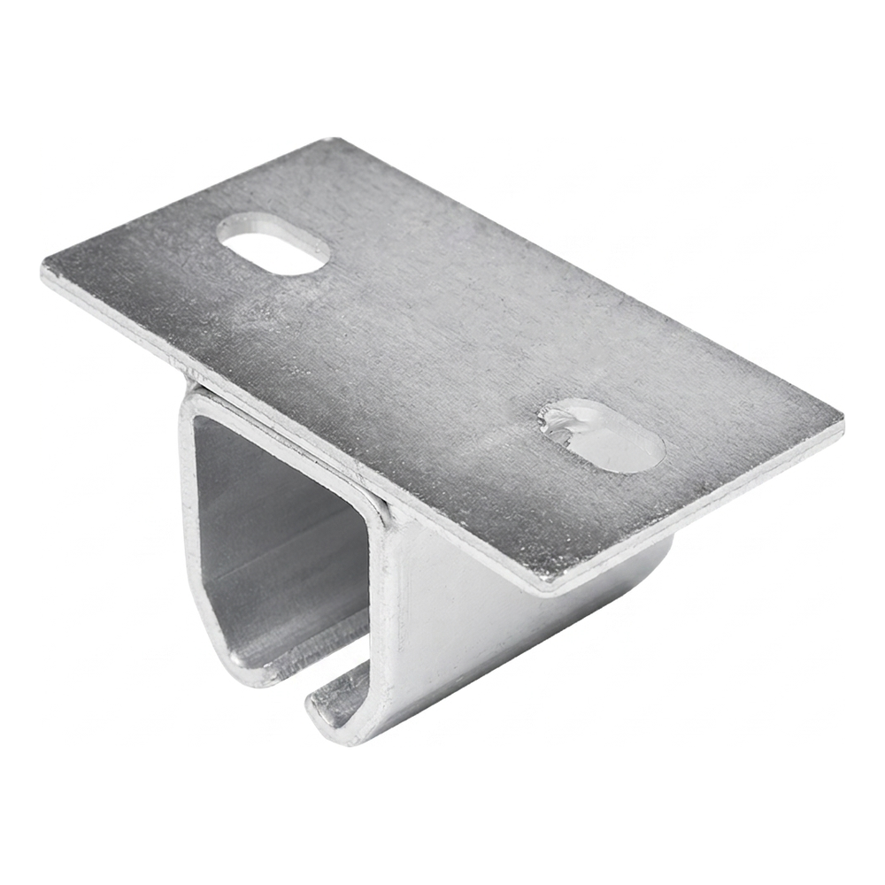 Závesný držiak sa skladá zo širokého montážneho plechu s otvormi na priskrutkovanie k nadpraziu alebo podpornej konštrukcii a z profilovaného uchytenia obopínajúceho koľaju zhora. Tvar profilu zabezpečuje stabilné osadenie ceovníka a rovnomerné prenášanie zaťažení. Montážne otvory (vrátane jedného oválneho) uľahčujú reguláciu pozície počas inštalácie, čo urýchľuje vyrovnanie koľaje na celej dĺžke brány.