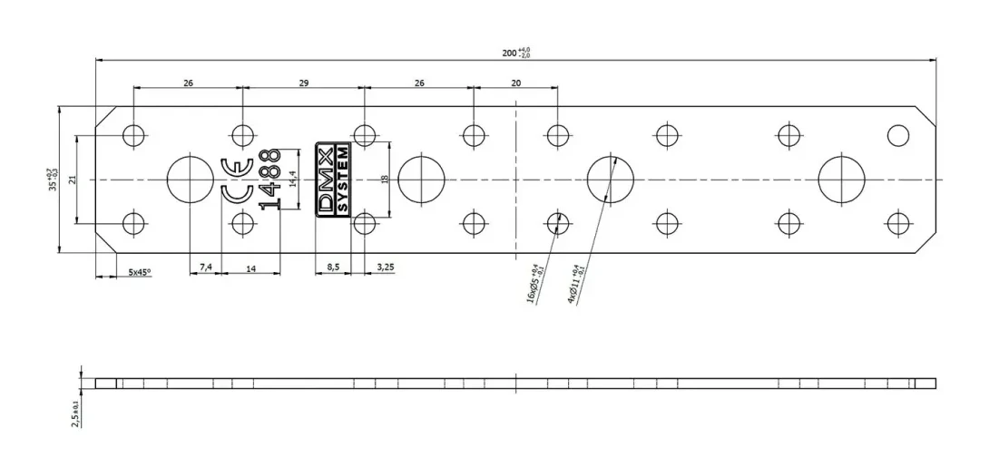 Plochá spojka LP 200×35 mm je univerzálny spojovací prvok určený na drevené spoje, v ktorých bočné plochy spájaných prvkov ležia v jednej rovine. Vďaka premyslenému rozmiestneniu 20 otvorov rôznych priemerov ju môžete použiť ako v štandardných tesárskych spojoch, tak aj v individuálne navrhovaných konštrukciách.