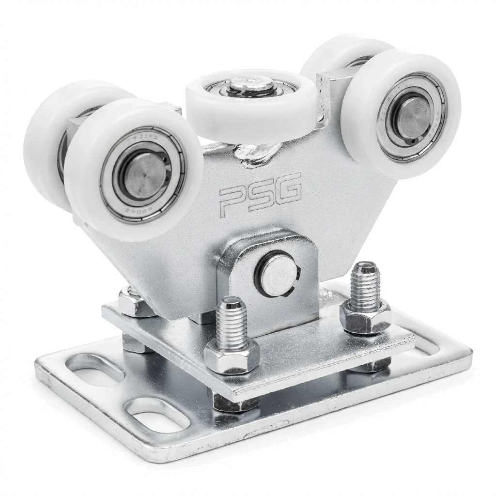 Vozík je vybavený 5 kladkami z plastu – 4 zvislými kladkami a 1 vodorovnou kladkou stabilizujúcou bočné odchýlky brány. Kladky sú uložené na guľkových ložiskách, čo zaručuje dlhú životnosť a minimálny odpor pri odvaľovaní. Spojenie s montážnou základňou je realizované pomocou čapu, ktorý umožňuje kývanie vozíka a kompenzáciu prípadných nerovností jazdnej dráhy.