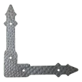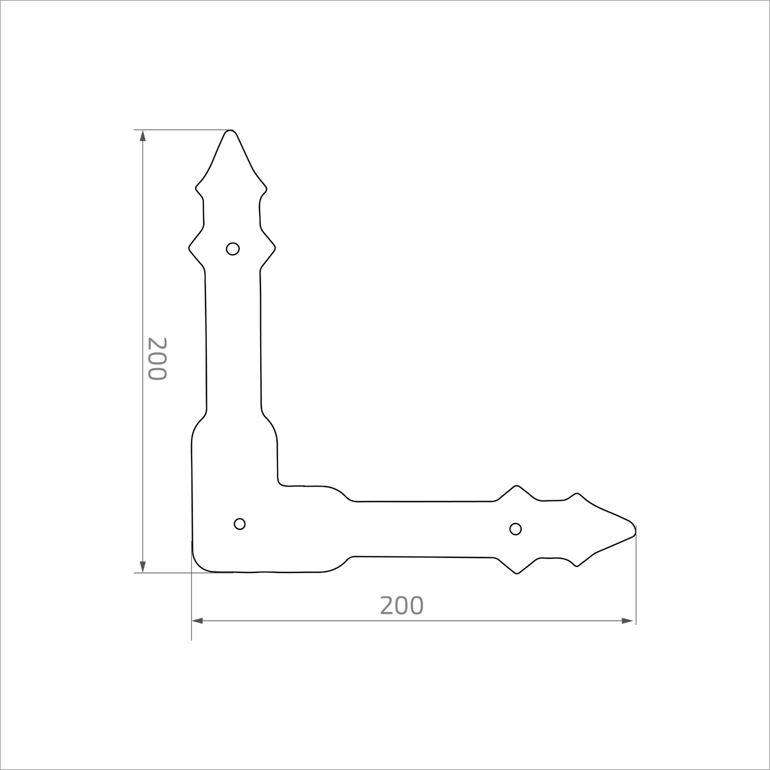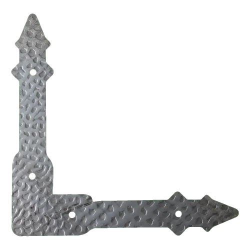 Oceľové vystuženie rohov 200×200 mm značky Postal je dekoratívne kovanie určené na vystužovanie a stužovanie rohov brán, furtek a dverí. Vďaka ozdobnej kladivkovej faktúre a charakteristickým zakončeniam v tvare hrotov prvok spája konštrukčnú funkciu s estetickou — ideálne sa hodí do štylizácie kovaných brán a plotov v rustikálnom štýle.