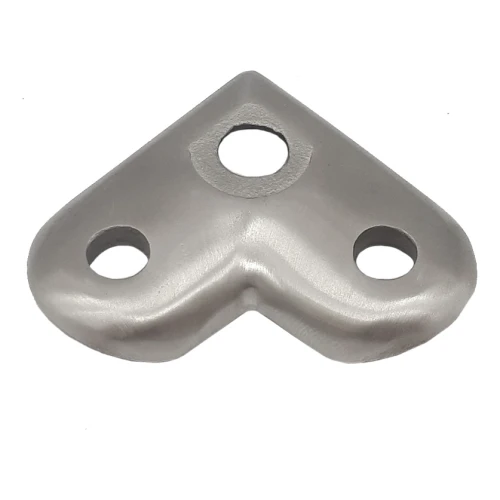 Platňa je určená pre upevnenie držiakov zábradlia na rohoch — tam, kde smer zábradlia mení smer. Montáž sa vykonáva priskrutkovaním platne zhora k plochému povrchu (napr. stĺpik alebo nosný stĺp). Tri montážne otvory zabezpečujú pevné, trojbodové upevnenie a eliminujú riziko otáčania prvku pod záťažou.