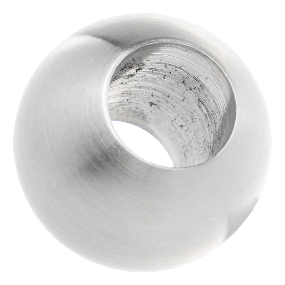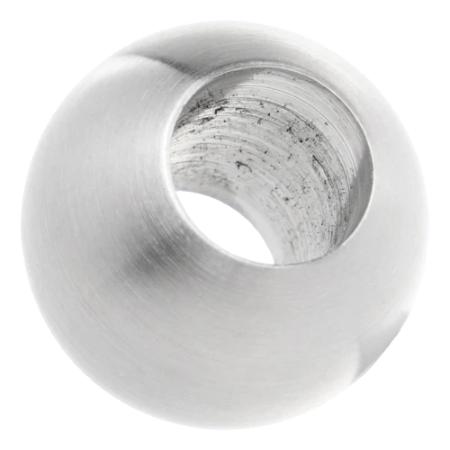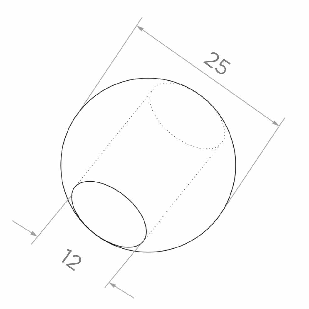 Priechodná guľa fi 25/12 mm z nerezovej ocele AISI 304 v saténovej úprave — univerzálny dekoračno-spájací prvok pre systémy zábrадlí a plotov z nerezovej ocele. Guľa je určená na montáž na tyče s priemerom 12 mm, cez ktoré prechádza na prieraz, vytvárajúc estetické spojenie alebo dekoračné ukončenie.