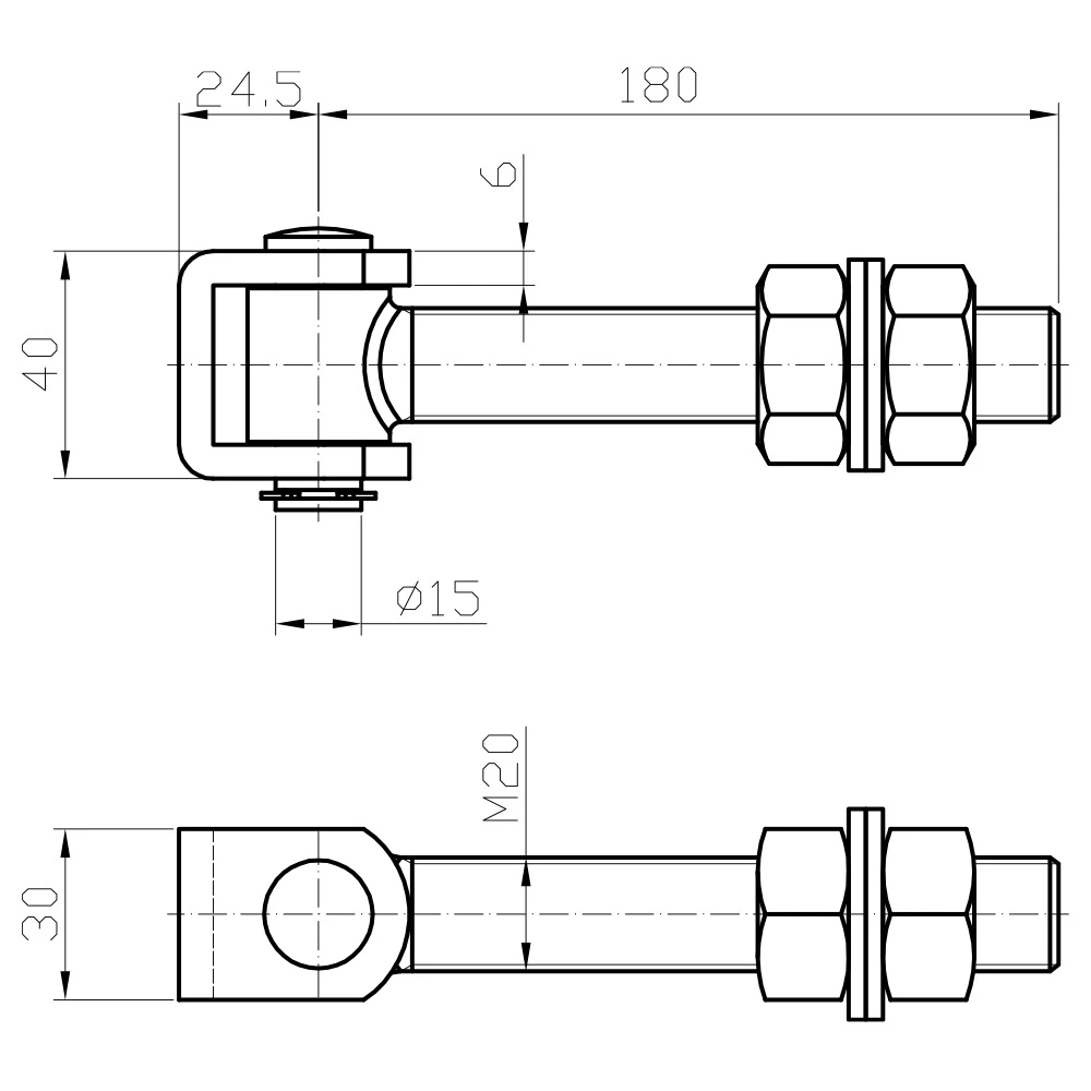 Regulovateľný záves M20 L180 mm je odolný prvok brankového kovania určený na zavesenie bránok a ľahkých krídlových brán. Vďaka závitovému čapu so skrutkou M20 a dvom regulačným maticiam umožňuje precíznu reguláciu pozície krídla kedykoľvek po dokončení montáže — ako pri prvom nastavení, tak pri neskorších korektúrach vyplývajúcich z prevísania konštrukcie alebo tepelných deformácií.