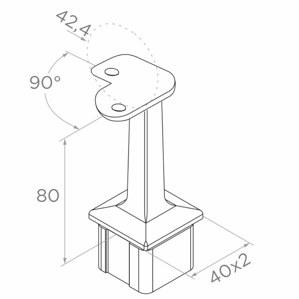 Rohová podpora zábradlia určená pre systémy balustrádu so štvorcovými stĺpikmi 40×40 mm. Prvok spája stĺpik s okrúhlym zábradlím s priemerom 42,4 mm pod uhlom 90°, čím vytvára trvalé a estetické rohové spojenie. Vyrobený z vysokokvalitnej nerezovej ocele AISI 304 v saténovom prevedení — odolnom voči korózii a ľahko udržiavateľnom.
