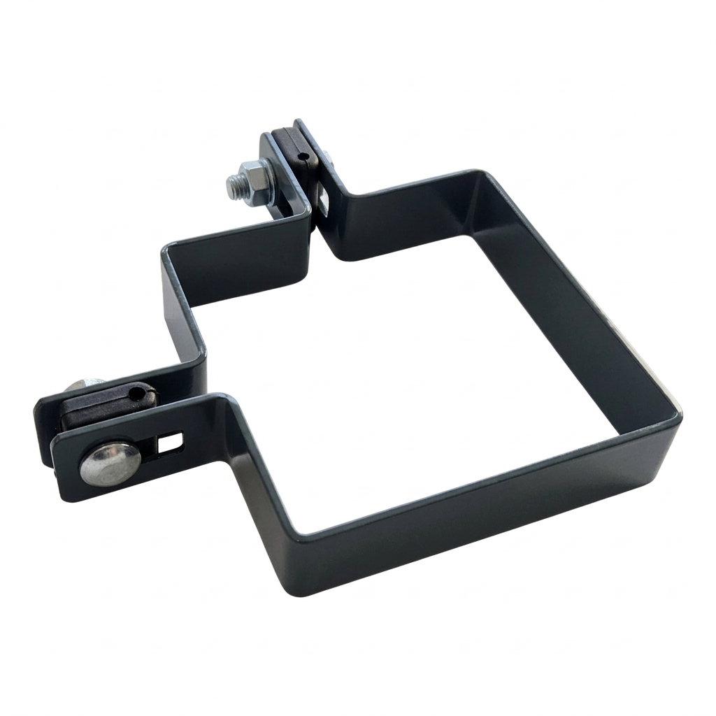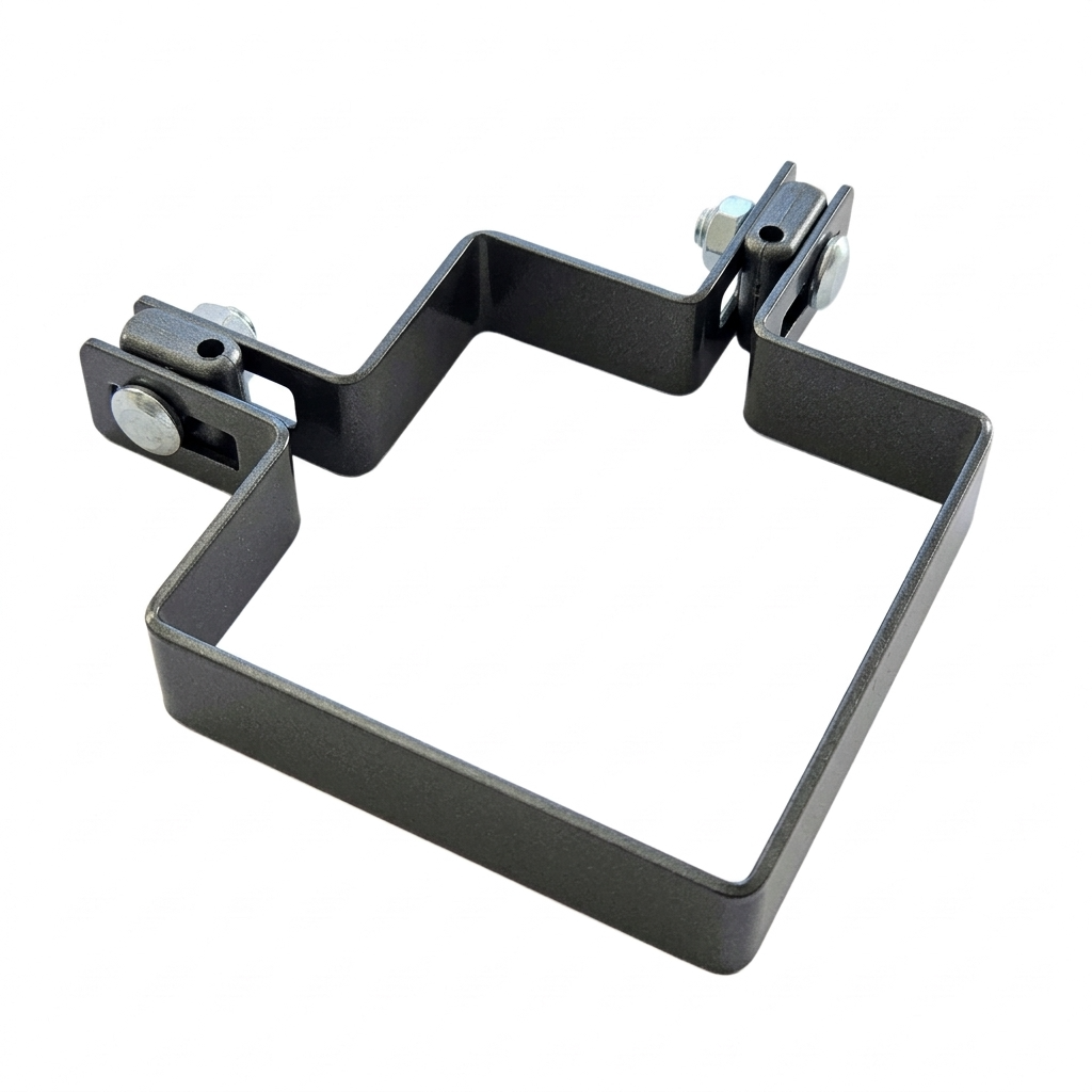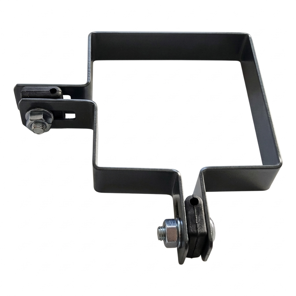 Svorka je dokonale prispôsobená prierezu stĺpika 100×100 mm, čo zaručuje stabilné a spoľahlivé spojenie plotovej konštrukcie. Montážne otvory v tvare fazule umožňujú reguláciu pozície panela vzhľadom na stĺpik — uľahčujú vyrovnanie oplotenia aj na nerovnom teréne.