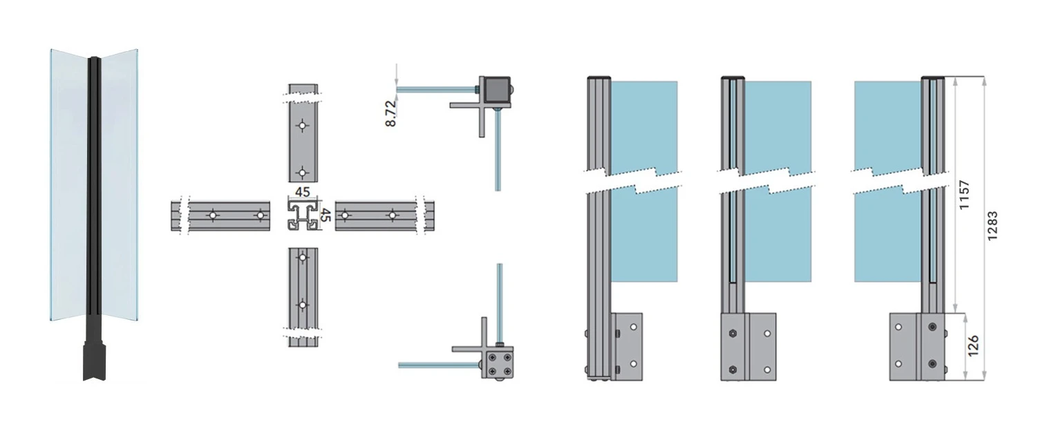 - Prierez profilu: 45×45 mm — vysoká tuhosť a stabilita v rohových miestach