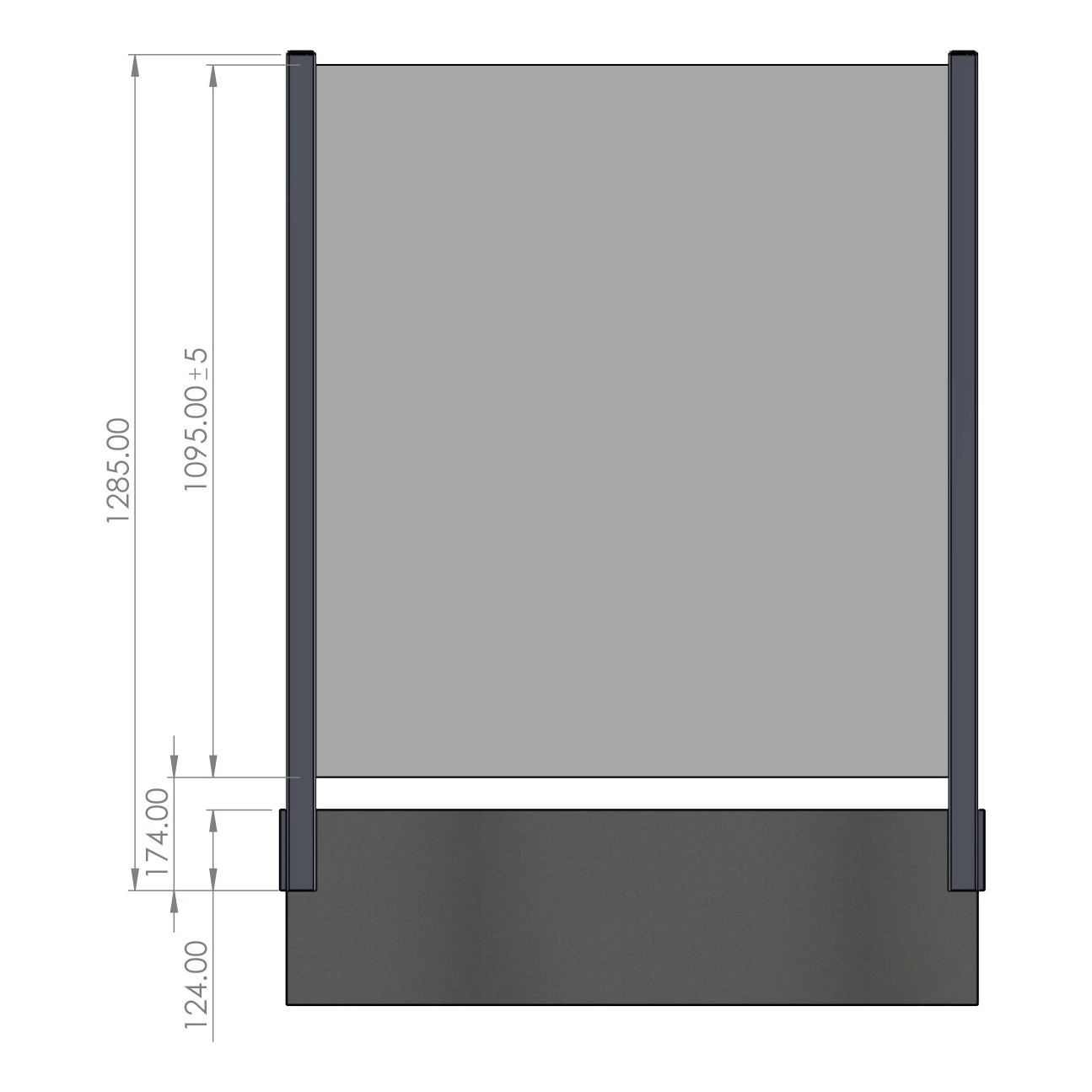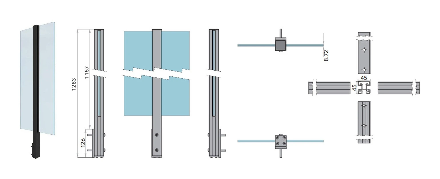 Po montáži stĺpika so skleným panelom je celková výška zábradlia 1285 mm. Sklo s maximálnou výškou 1095 mm ±5 mm je osadené vo vodiacej lište profilu a vzdialenosť od spodnej hrany stĺpika k spodnej hrane skla je 174 mm. Výška spodného krytu (montážny element) je 124 mm. Bočný spôsob upevnenia umožňuje zachovať plnú úžitkovú plochu balkóna alebo terasy — nič nevyčnieva na dosku.