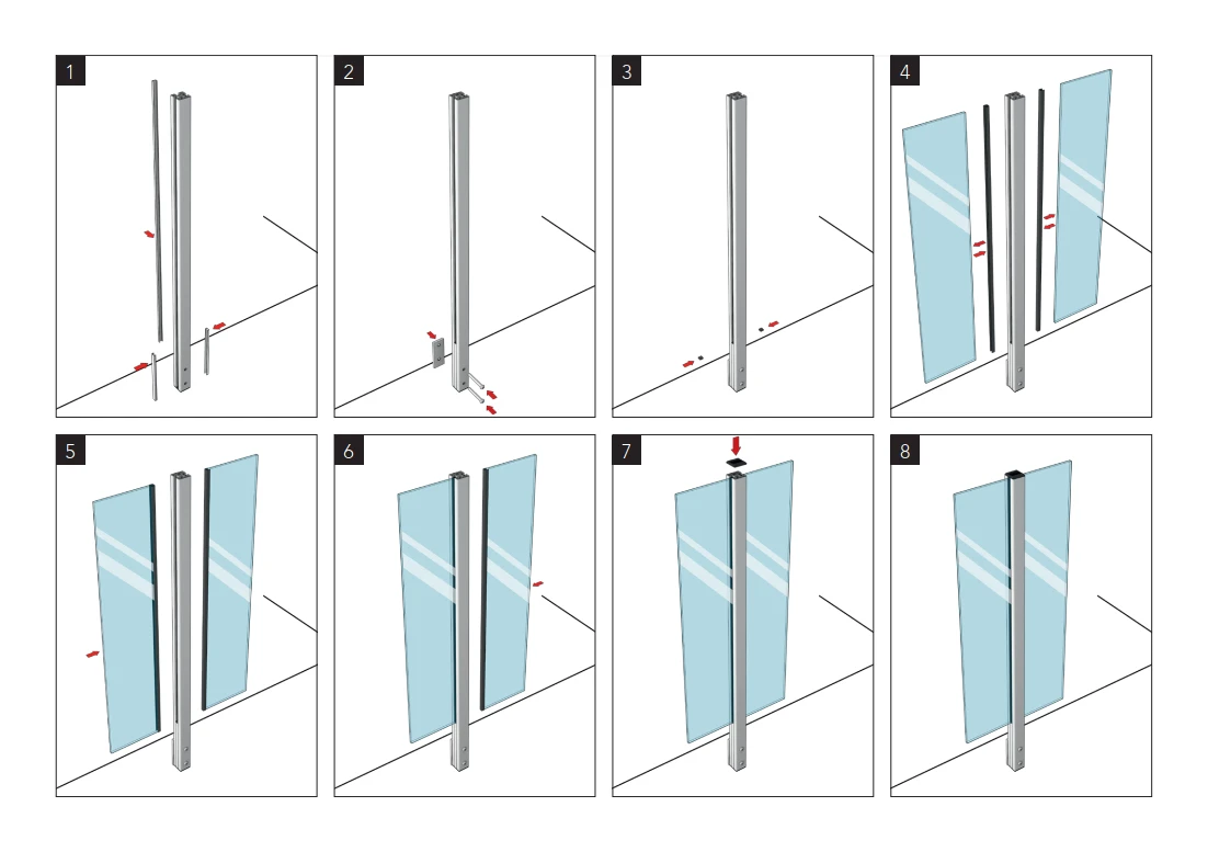 Návod na montáž zahŕňa 8 jednoduchých krokov — od pripevnenia montážneho profilu na stenu, cez osadenie stĺpika na základný element, až po zasunutie sklenených panelov a zabezpečenie záslepkou. Vďaka systému bočného upevnenia na 4 otvory prebieha celá inštalácia rýchlo a nevyžaduje špecializované náradie.