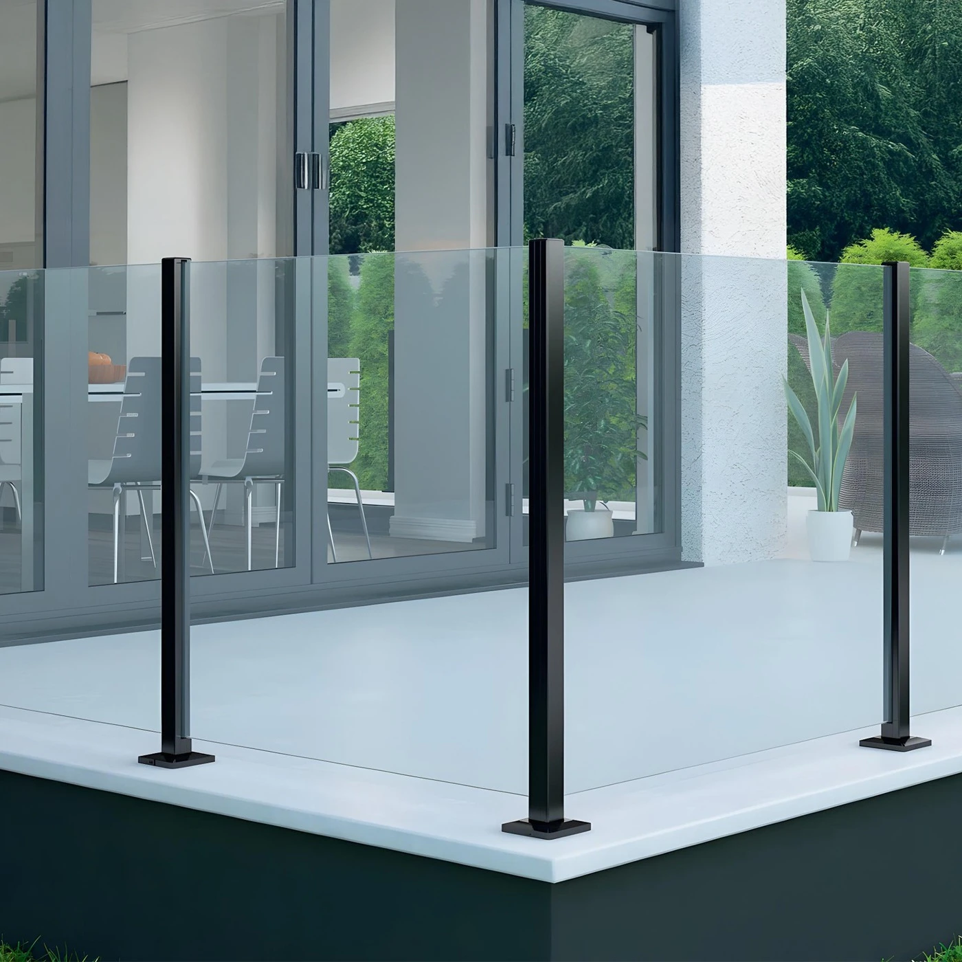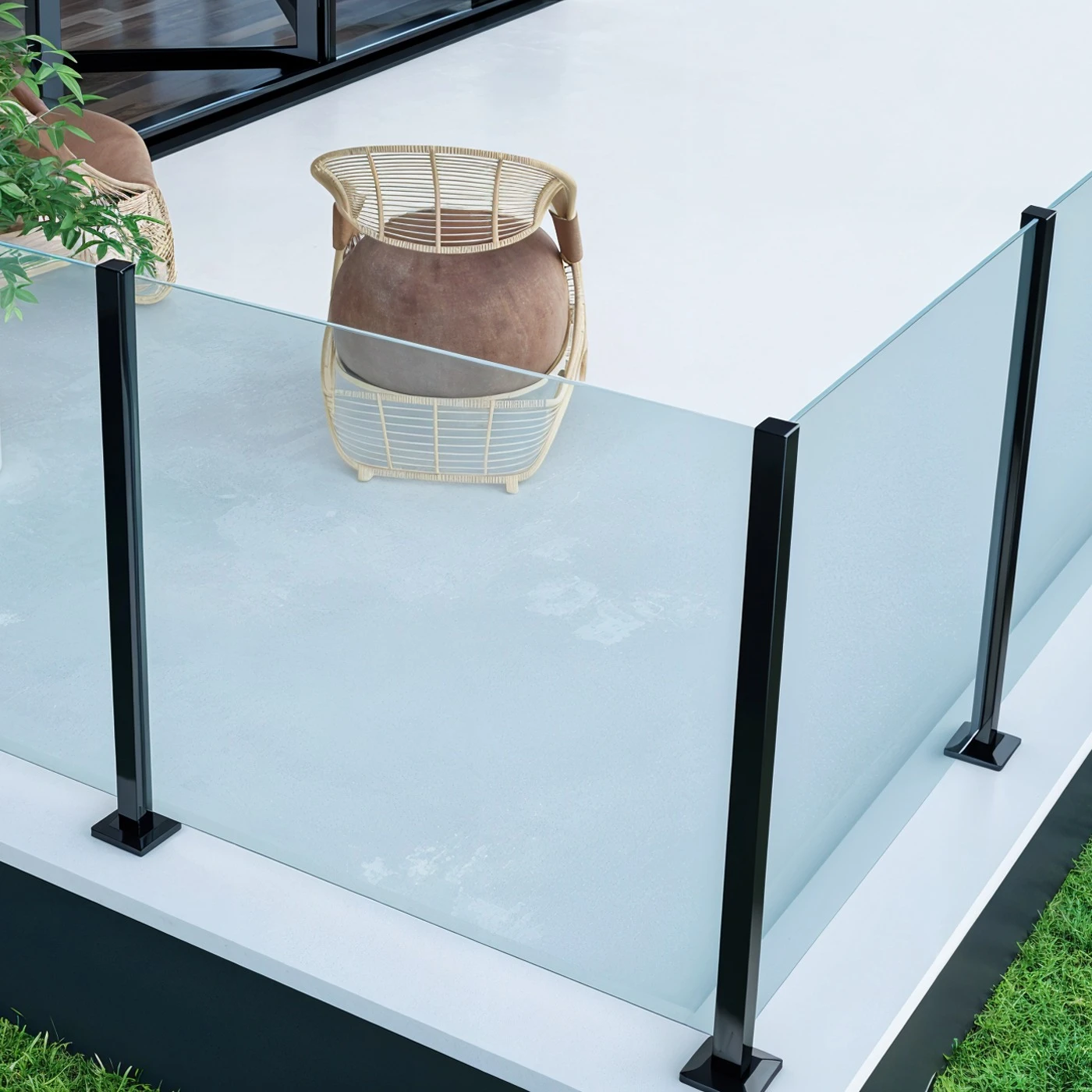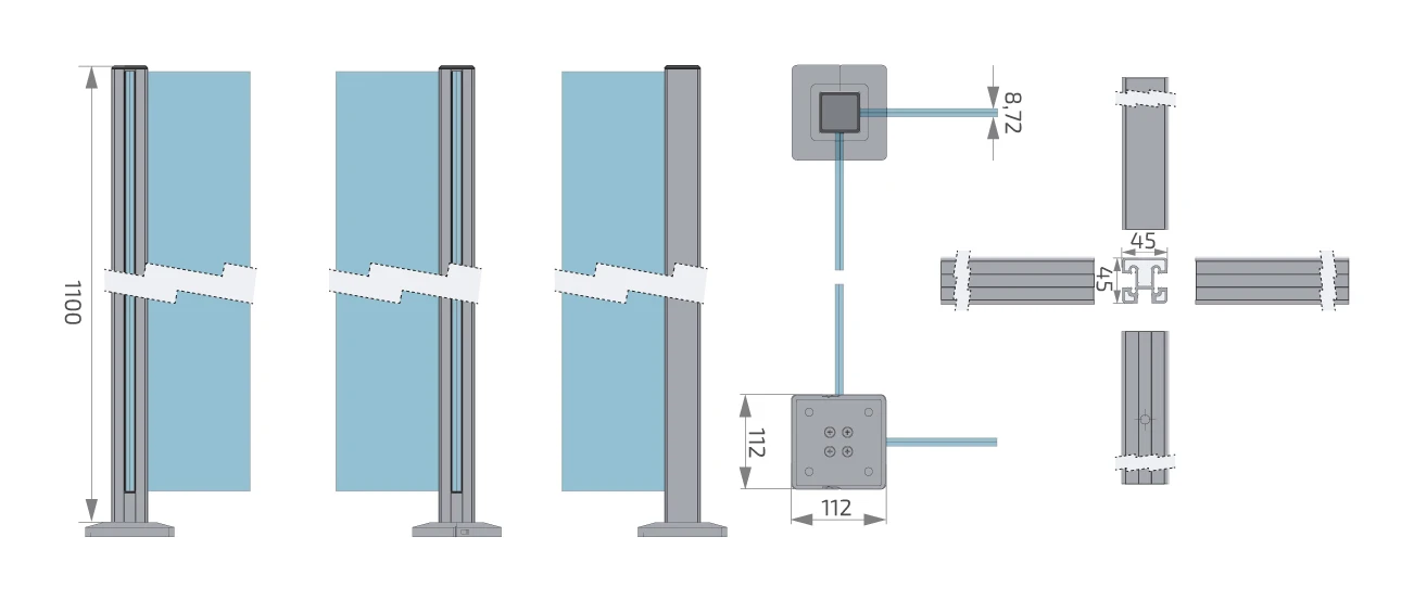 Profil s prierezom 45×45 mm a výškou 1100 mm je určený pre laminované sklo hrúbky 8,72 mm. Systém montáže do podlahy s plochou základňou 112×112 mm zaručuje stabilitu konštrukcie a umožňuje rýchle kotvenie do betónu alebo iného nosného podkladu. Elegantné čierne, matné povrchovanie získané metódou práškového maľovania zabezpečuje odolnosť proti atmosférickým vplyvom a dodáva zábradliam moderný, minimalistický charakter.