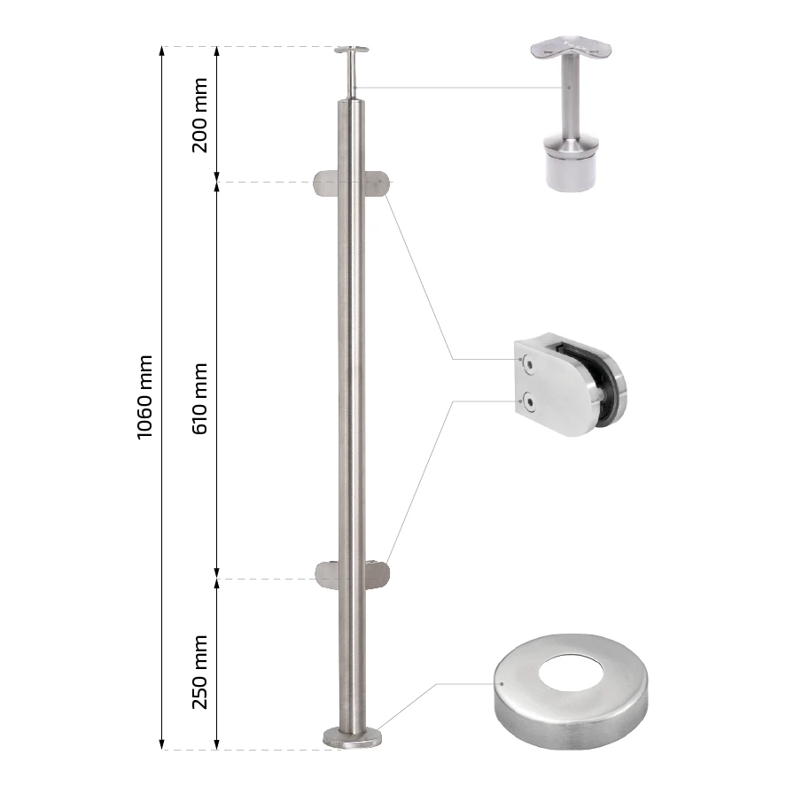 Rohový zábradlový stĺpik pre sklo fi 42,4x1060/1102,4mm 4 úchyty brúsený