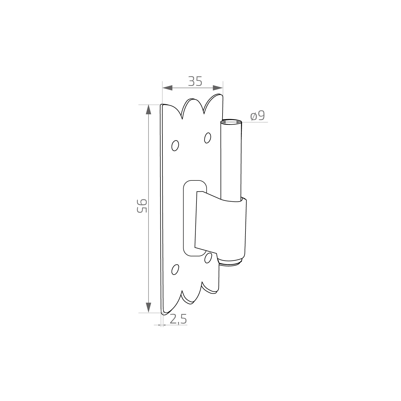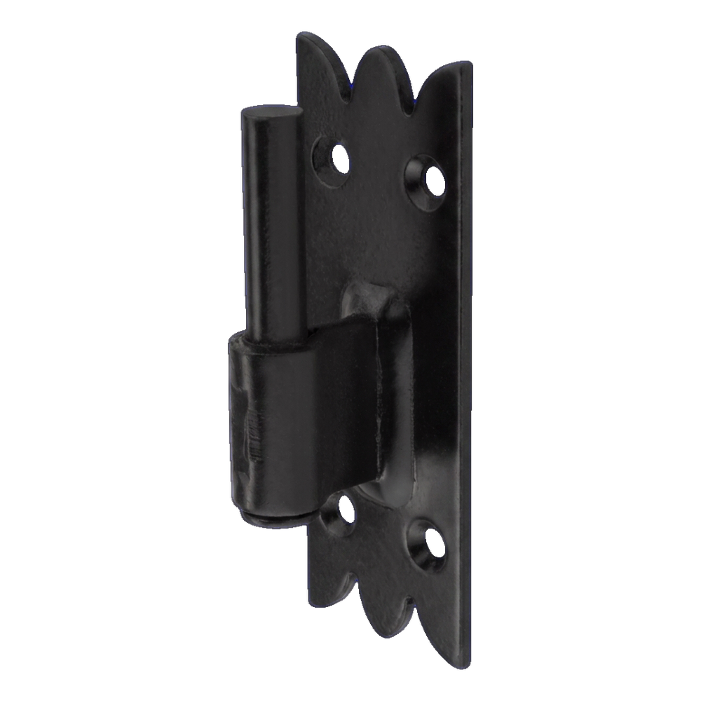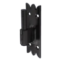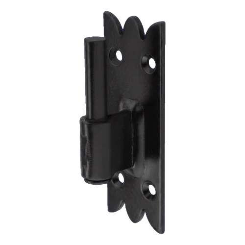 Stavebné okeničkové ozdobné pántové záves v čiernej farbe určené na pohyblivé spojenie okienok s okenným rámom alebo zárubňou. Dekoratívne spracovaný montážny plech s charakteristickým vzorom zúbkovaných okrajov umožňuje estetické zapojenie závesy do tradičných a rustikálnych fasád. Solidná konštrukcia z pozinkovanej ocele zabezpečenej olejovým lakom zabezpečuje vysokú odolnosť proti korózii a mechanickému poškodeniu — aj v náročných atmosférických podmienkach.