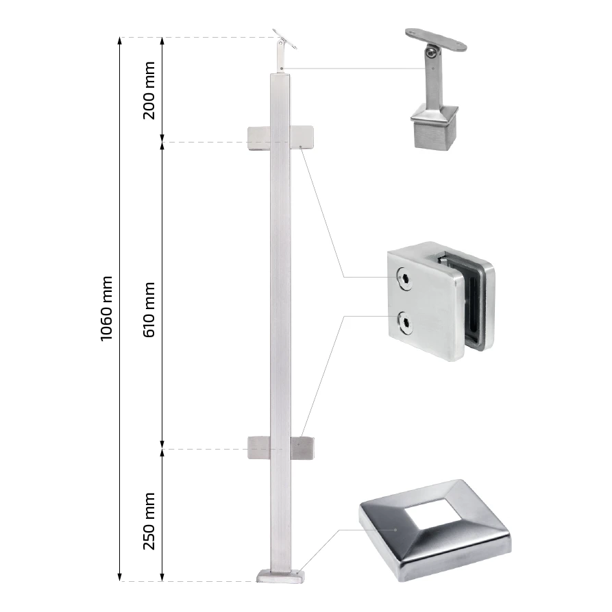 Stredný balustradový stĺpik 40x40x1060/1100mm 4 uchytenia na sklo AISI 304