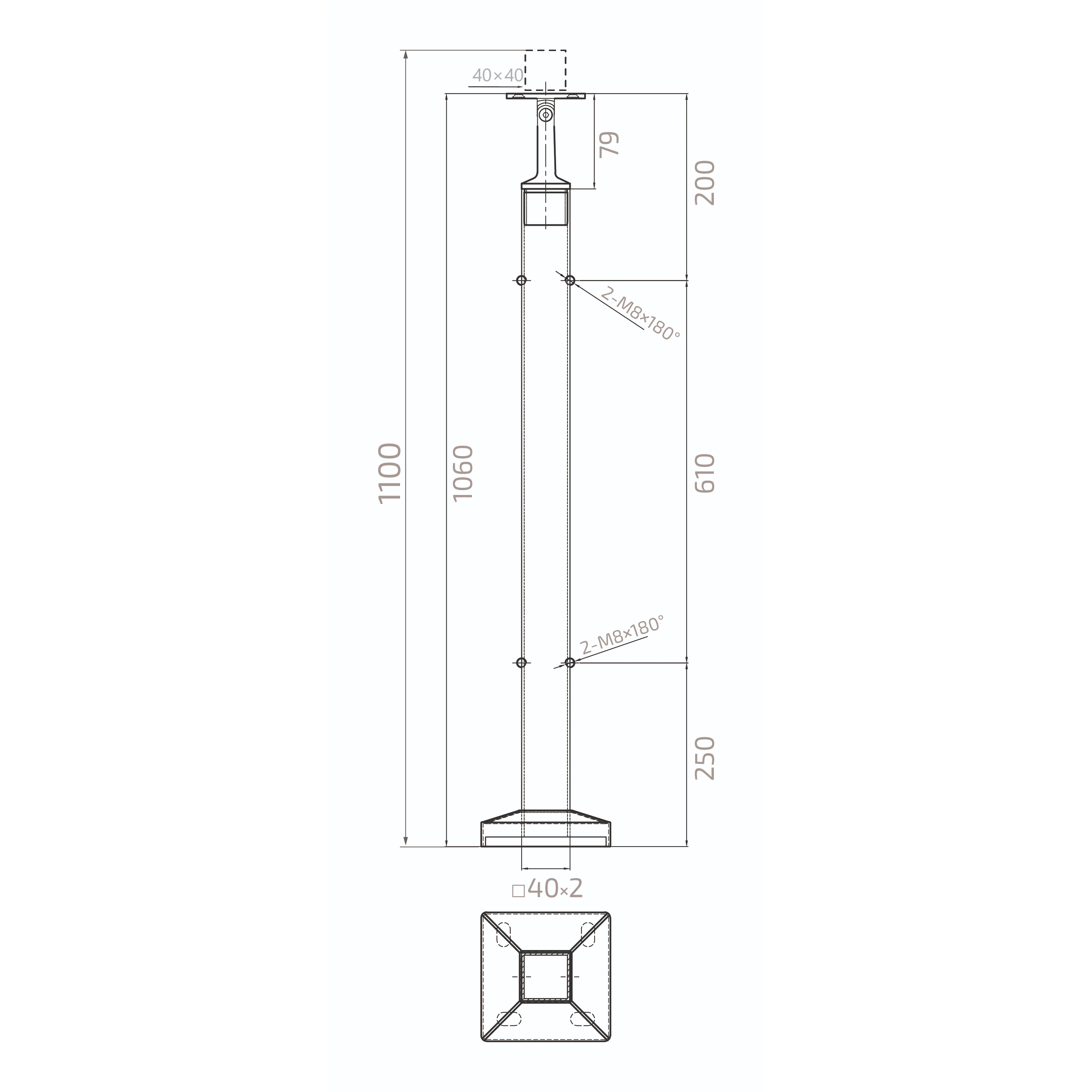 Stĺpik je určený na montáž do podlahy ako stredný prvok zábradlia. Celková výška konštrukcie s madlom dosahuje 1100 mm, čo zodpovedá štandardným požiadavkám pre zábradlia. Podpora madla nie je natrvalo prilepená — montáž sa vykonáva pomocou anaeróbneho lepidla pre nerezovú oceľ, čo dáva úplnú voľnosť pri nastavovaní a možnosť skrátenia stĺpika v prípade nerovností podlahy. Uchytenia namontované na dvoch úrovniach (rozstup 610 mm) umožňujú pevné držanie tvrdených alebo laminovaných sklenených tabúľ.
