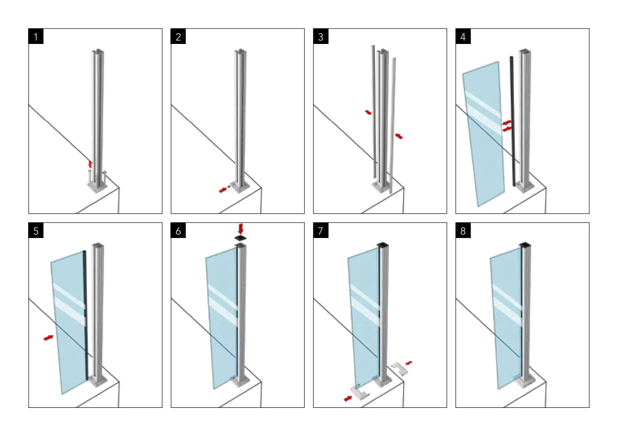 Montáž stredného stĺpika Kozza je jednoduchá a prebieha v 8 krokoch — od kotvania základne do podlahy, cez osadenie profilu a sklenenej tabule, až po namontovanie krycej lišty a záslepky. Intuitívny plochý systém eliminuje potrebu používať špecializované náradie, čo výrazne skracuje čas práce na stavbe.