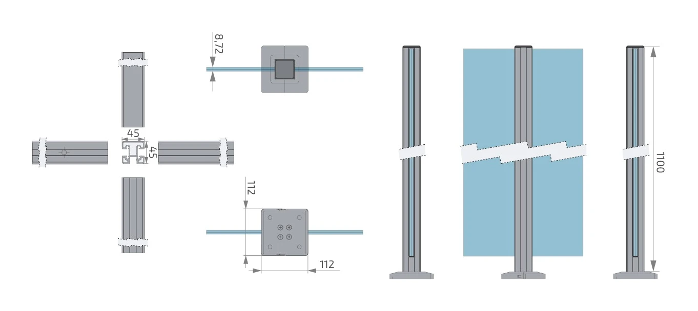 Profil s prierezom 45 × 45 mm má pozdĺžnu drážku presne prispôsobenú sklu hrúbky 8,72 mm (bezpečnostný laminát 2 × 4 mm + PVB fólia). Štíhla, geometrická forma profilu zabezpečuje stabilitu konštrukcie pri zachovaní vizuálnej ľahkosti celého zábradlia.