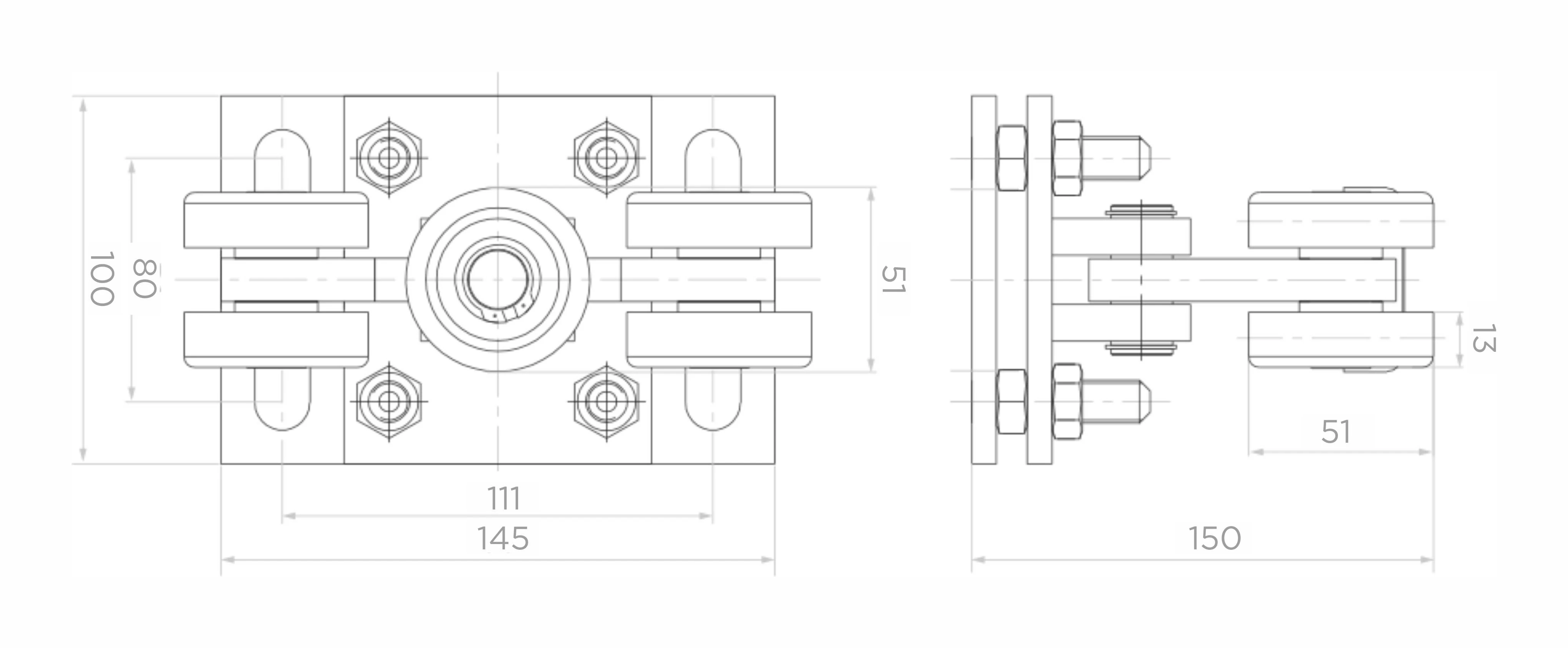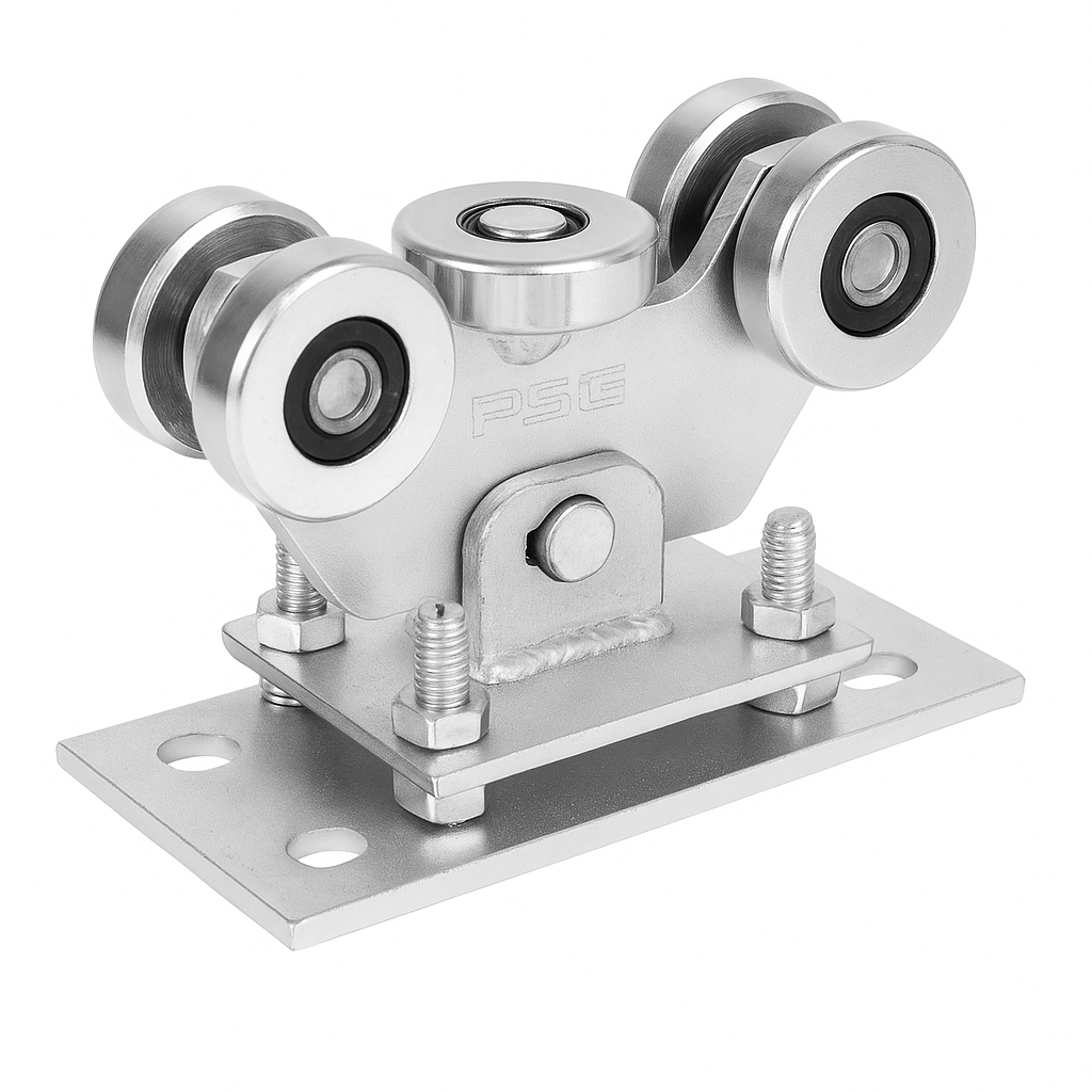 Pojezdový vozík s 5 kovovými kladkami tvorí srdce súpravy. Konštrukcia je kyvná — vozík je spojený so základňou pomocou čapu, čo mu umožňuje automaticky sa prispôsobovať koľajnici posuvnej brány. Štyri zvislé kladky vedú koľajnicu z bokov a jedna vodorovná kladka preberá zvislé zaťaženie. Nastaviteľná výška pomocou montážnych skrutiek zabezpečuje presné nastavenie brány. Pozinkované prevedenie zaručuje odolnosť voči korózii a dlhodobú prevádzku vonku.