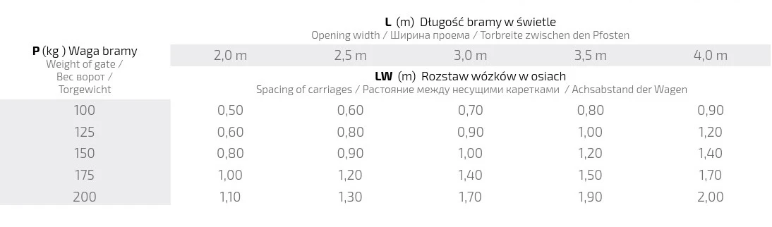 Uvedená tabuľka zobrazuje odporúčaný rozostup osí pojezdových vozíkov (LW) v metroch v závislosti od hmotnosti brány (P) a dĺžky brány v svetlosti (L). Správny výber rozostupu je kľúčový pre rovnomerné rozloženie zaťaženia a životnosť celého jazdného systému: