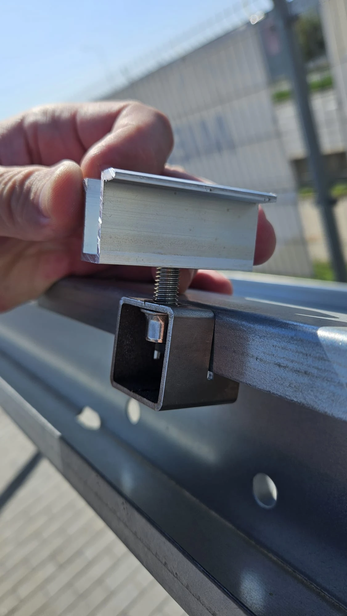 Nasledujúce fotografie predstavujú držiak ZU-1 osadený na oceľovej late s fotovoltaickou klemou — hotový montážny bod panelu: