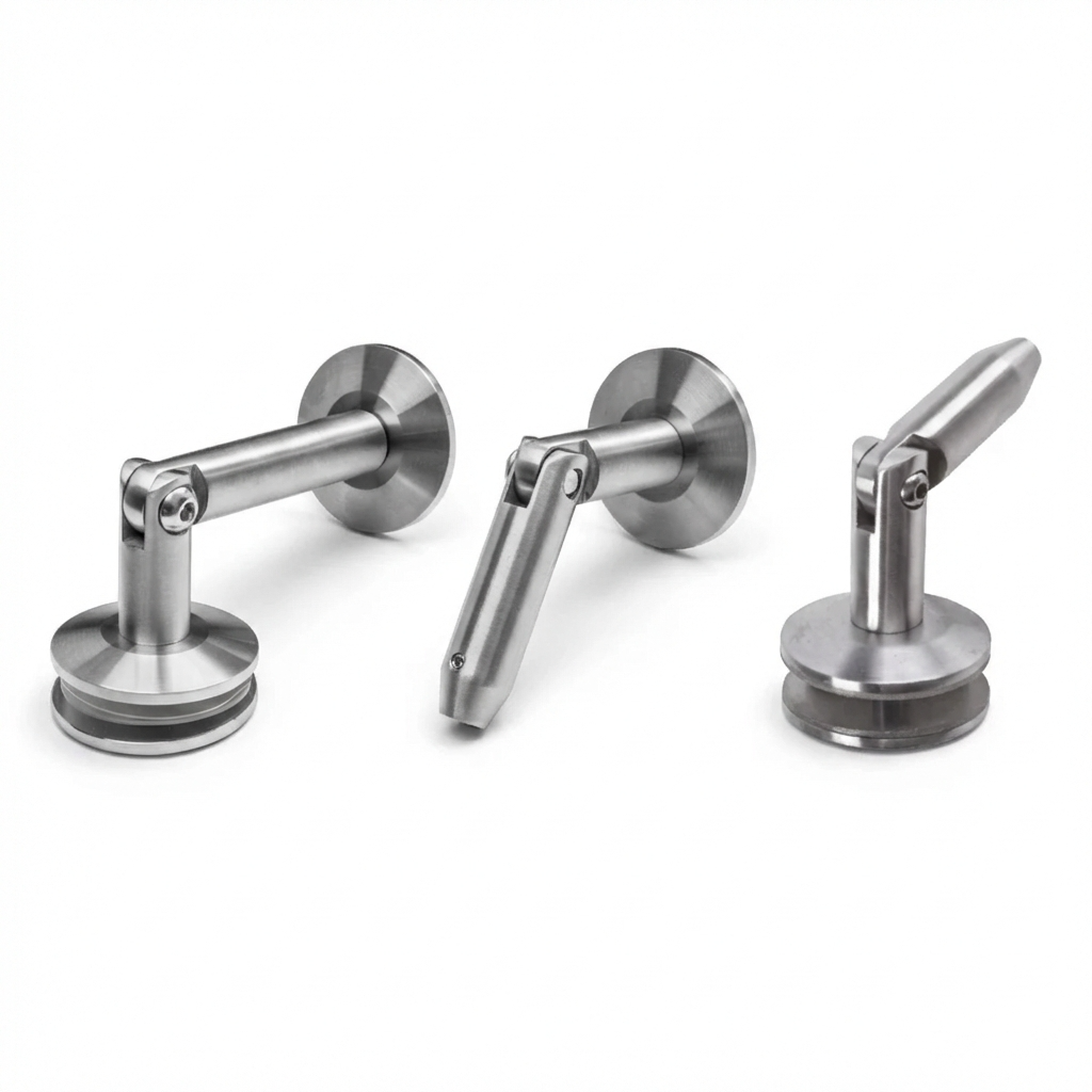 Systém sa skladá z troch presne vyrobených spájačov z nehrdzavejúcej ocele AISI 304 v saténovom prevedení, ktoré zaručujú dlhú životnosť a estetický vzhľad na roky. Každý prvok má zakrytý montážny otvor, čo dodáva celej konštrukcii elegantný, minimalistický charakter. Sklo nie je v priamom kontakte s kovom — súčasťou sady sú tlačné gumičky, ktoré chránia tabuľu a zároveň ju stabilizujú v správnej polohe.
