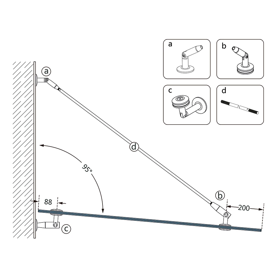 Trojdielny systém montáže sklenených prístreškov určený na profesionálne upevnenie sklenených striešok nad vchodmi do obytných budov a objektov občianskej vybavenosti. Sada umožňuje bezpečnú inštaláciu sklenených tabúľ s hrúbkou od 8 do 17,52 mm a je kompatibilná s tiahladlami so závitom M10.