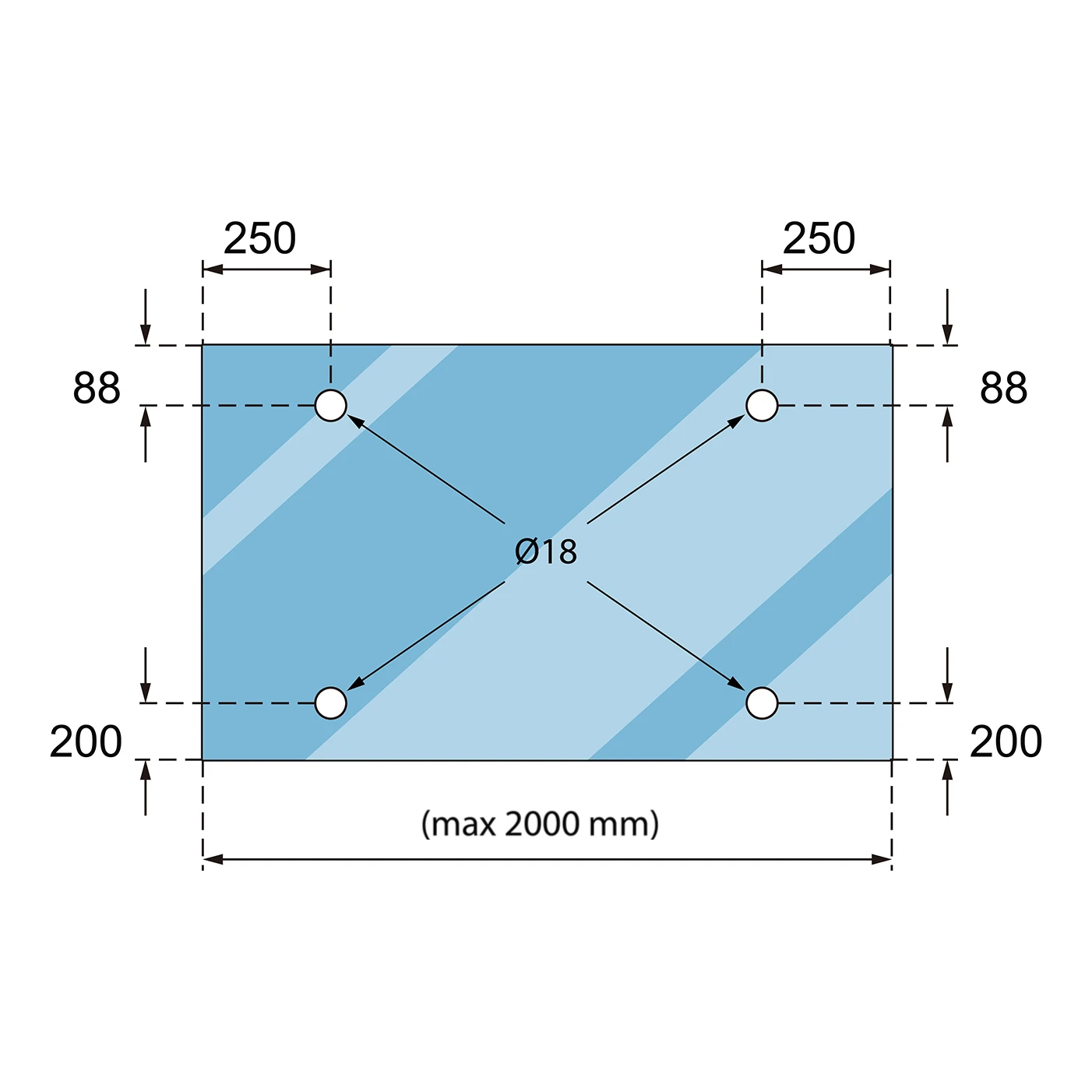 - Horné otvory (spájače stena–sklo): 88 mm od horného okraja, 250 mm od bočných okrajov