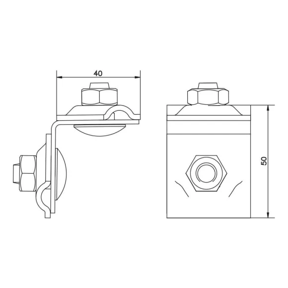Upevnenie sa realizuje pomocou dvoch skrutiek M10×30 z pozinkovanej ocele, čo zabezpečuje pevné a stabilné spojenie s podkladom strechy. Kompaktné rozmery (40×50 mm) uľahčujú montáž aj na ťažko prístupných miestach.