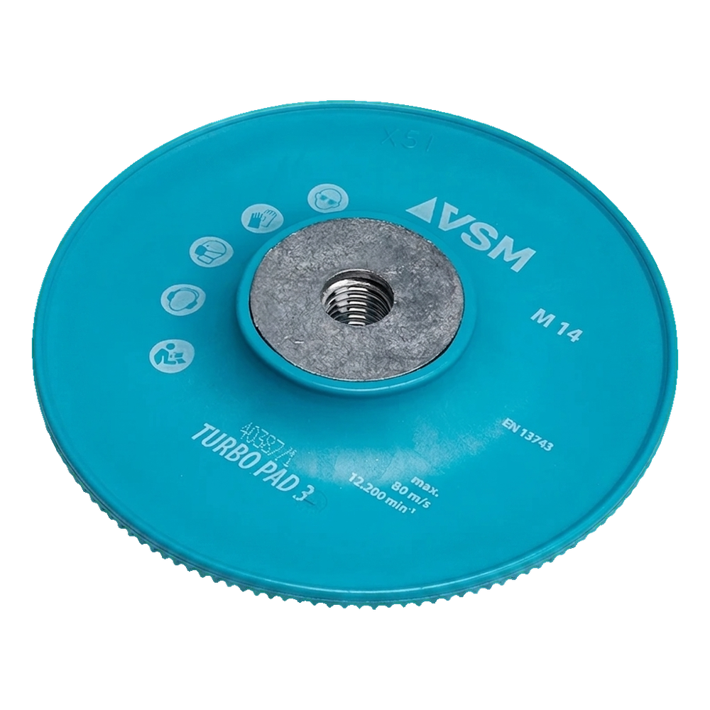 VSM Turbo Pad 3 je profesionálna rebrovaná podložka určená na upevnenie fibrových kotúčov s priemerom 125 mm na uhlových brúskach s závitom M14. Jedinečná konštrukcia s radiálnymi rebrami zabezpečuje účinnú cirkuláciu vzduchu pod kotúčom, čo výrazne znižuje teplotu v zóne brúsenia — predlžuje životnosť kotúča aj samotnej podložky.