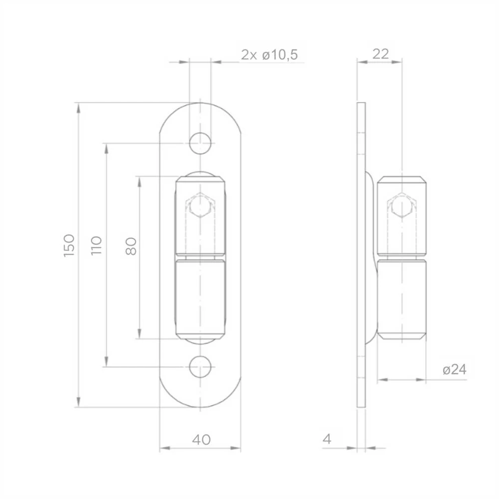 Pant je určený na priskrutkovanie — dva montážne otvory s priemerom 10,5 mm umožňujú upevnenie pomocou skrutiek M10. Osvedčuje sa ako prvok zavesenia krídiel vjezdových brán, záhradných bránok a iných ťažkých konštrukcií oplotení. Solidná oceľová konštrukcia a valčená guľa zabezpečujú dlhodobú, bezporuchovú prácu aj v náročných atmosférických podmienkach.