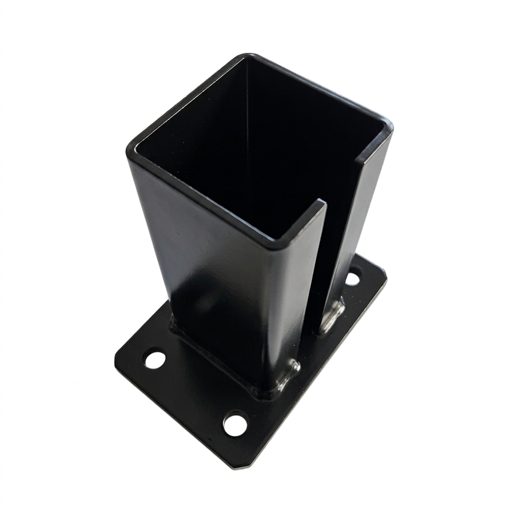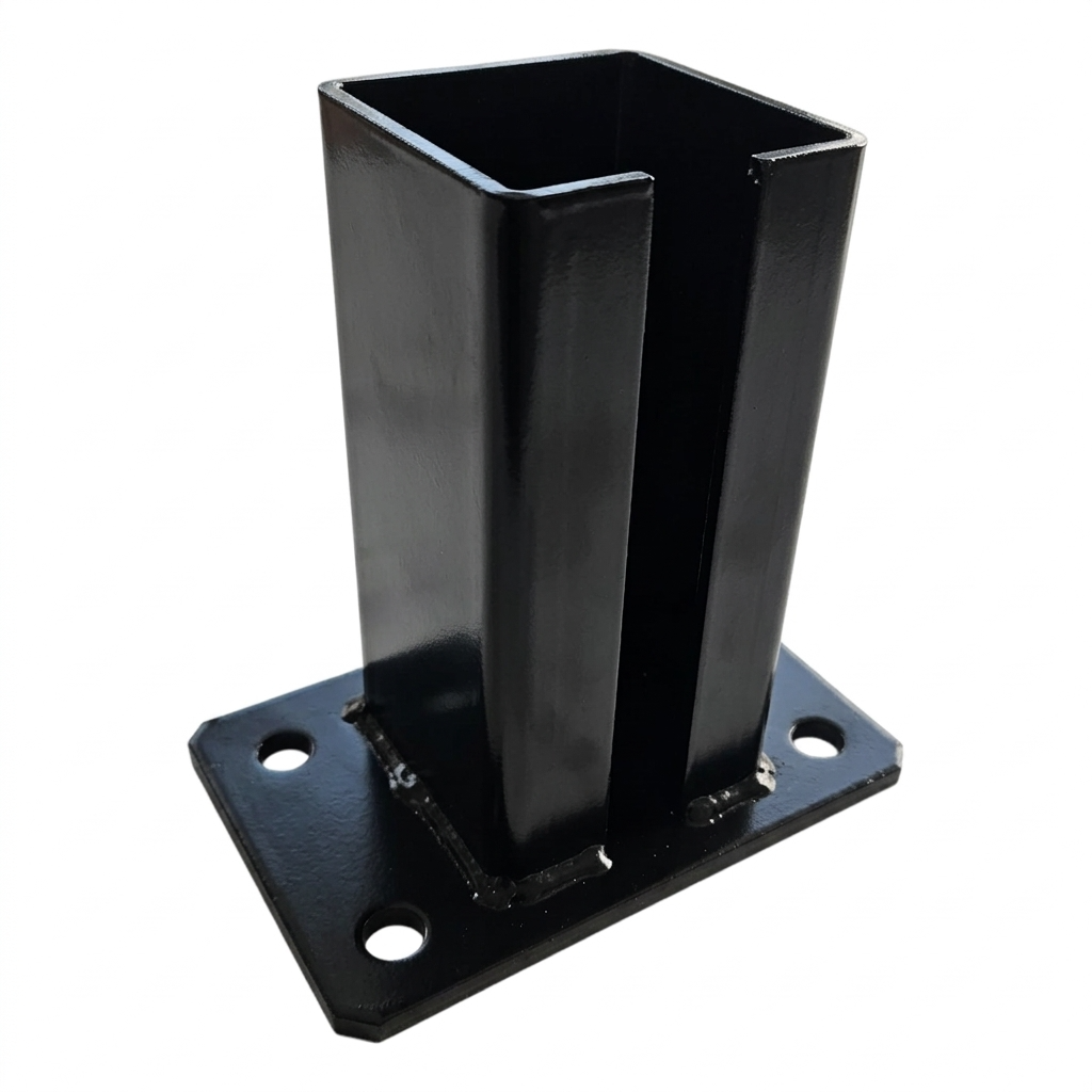 Oceľová základňa (pätka) na brankový a oplotový stĺpik 80×80 mm v čiernej farbe RAL 9005 je odolný montážny prvok umožňujúci rýchle a spoľahlivé upevnenie profilových stĺpikov na betónové povrchy, podmurovky a iné spevnené podklady. Vďaka povrchové úprave práškovým lakovaním v farbe RAL 9005 produkt zabezpečuje estetický, jednotný vzhľad ideálne komponujúci sa s modernými panelovými oploteniami a bránkami v čiernych odtieňoch — pri súčasnej účinnej protikoróznej ochrane.
