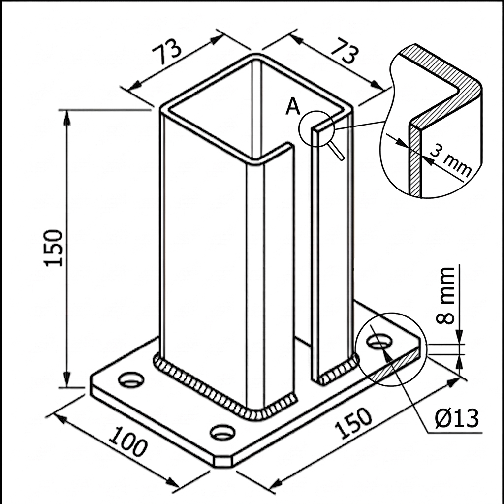 Konštrukcia sa skladá z otvoreného štvorcového profilu 73×73 mm (prispôsobeného stĺpiku 80×80 mm) prispajkovaného k masívnej montážnej platni so štyrmi otvormi pod kotviace skrutky. Kútový zvar pri základni profilu garantuje spoľahlivé prenášanie zaťažení. Zvislá štrbina v profile umožňuje presné prispôsobenie a kompenzáciu tolerancií stĺpika.