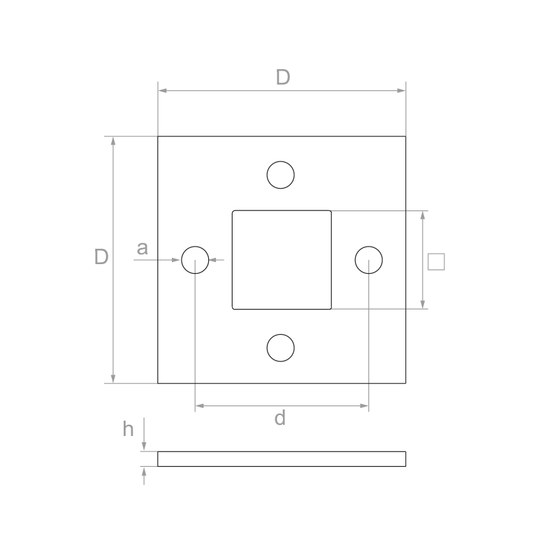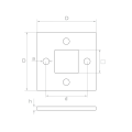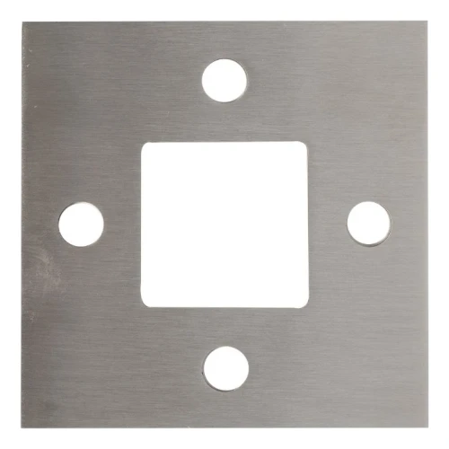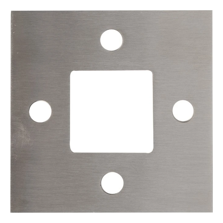 Štvorcová základňa stĺpa zábradlia určená na zváranie, venovaná systému stĺpikov 40×40 mm. Vyhotovená z nerezovej ocele AISI 304 s povrchovú úpravou satén, zabezpečuje pevné a estetické uchytenie stĺpa zábradlia k podkladu. Štyri montážne otvory umožňujú spoľahlivé priskrutkovanie základne, a centrálny štvorcový otvor umožňuje presné osadenie a zvarenie stĺpika.