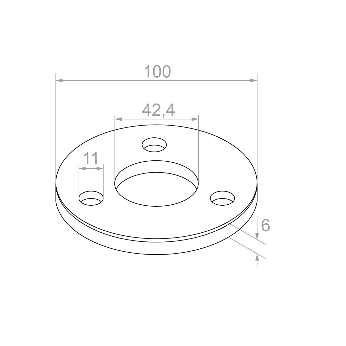 Základňa má tri montážne otvory s priemerom 11 mm rozmiestnené rovnomerne po obvode, čo umožňuje spoľahlivé a symetrické upevnenie. Centrálny otvor s priemerom 42,4 mm je prispôsobený rúram stĺpikov systému 42,4 mm — stĺpik sa privarí priamo do otvoru, čím sa získa trvanlivé a tuhé spojenie.