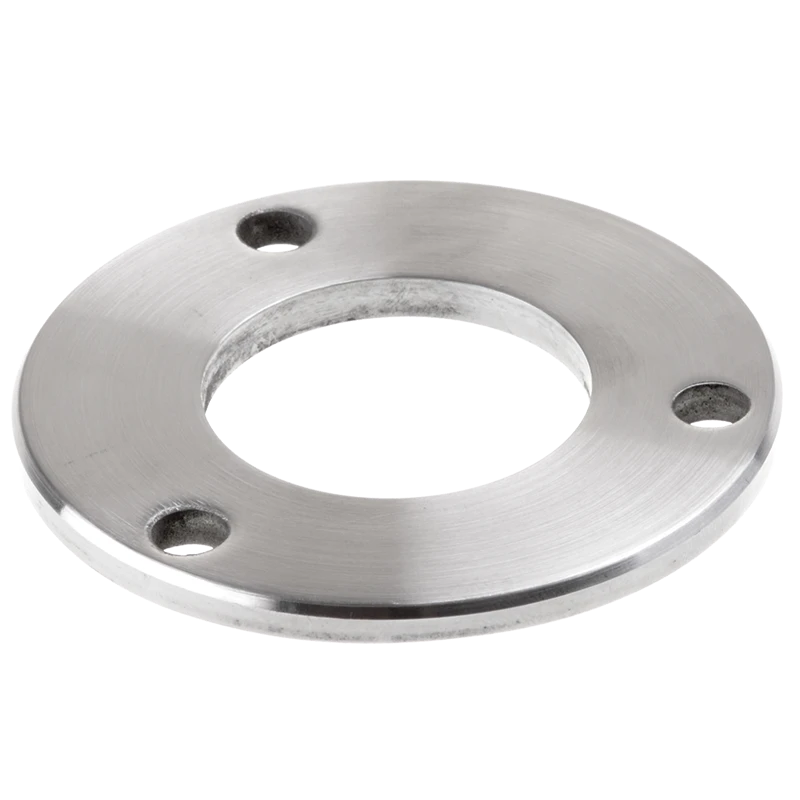 Základňa je určená na zváranie stĺpikov zábradlia v systéme rúr fi 42,4 mm. Montáž spočíva v osadení rúry stĺpika do centrálneho otvoru a vykonaní obvodového zvaru. Tri montážne otvory fi 8,5 mm rozmiestnené symetricky po obvode umožňujú dodatočné mechanické kotvenie k podkladu, čo zvyšuje nosnosť a tuhosť konštrukcie. Nerezová oceľ AISI 304 zabezpečuje vysokú odolnosť proti korózii — prvok je vhodný tak pre vnútorné, ako aj vonkajšie použitie.