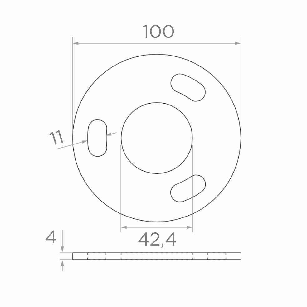 Okrúhla základňa stĺpa na privárannie určená na montáž stĺpikov zábradlia s priemerom 42,4 mm. Pevný konštrukčný prvok zabezpečujúci stabilitu a pevnosť celej konštrukcie nerezového zábradlia. Vďaka trom oválnym montážnym otvorom (fazuľkám) základňa umožňuje presnú reguláciu polohy kotevných skrutiek, čo výrazne uľahčuje montáž na nerovnom podklade.