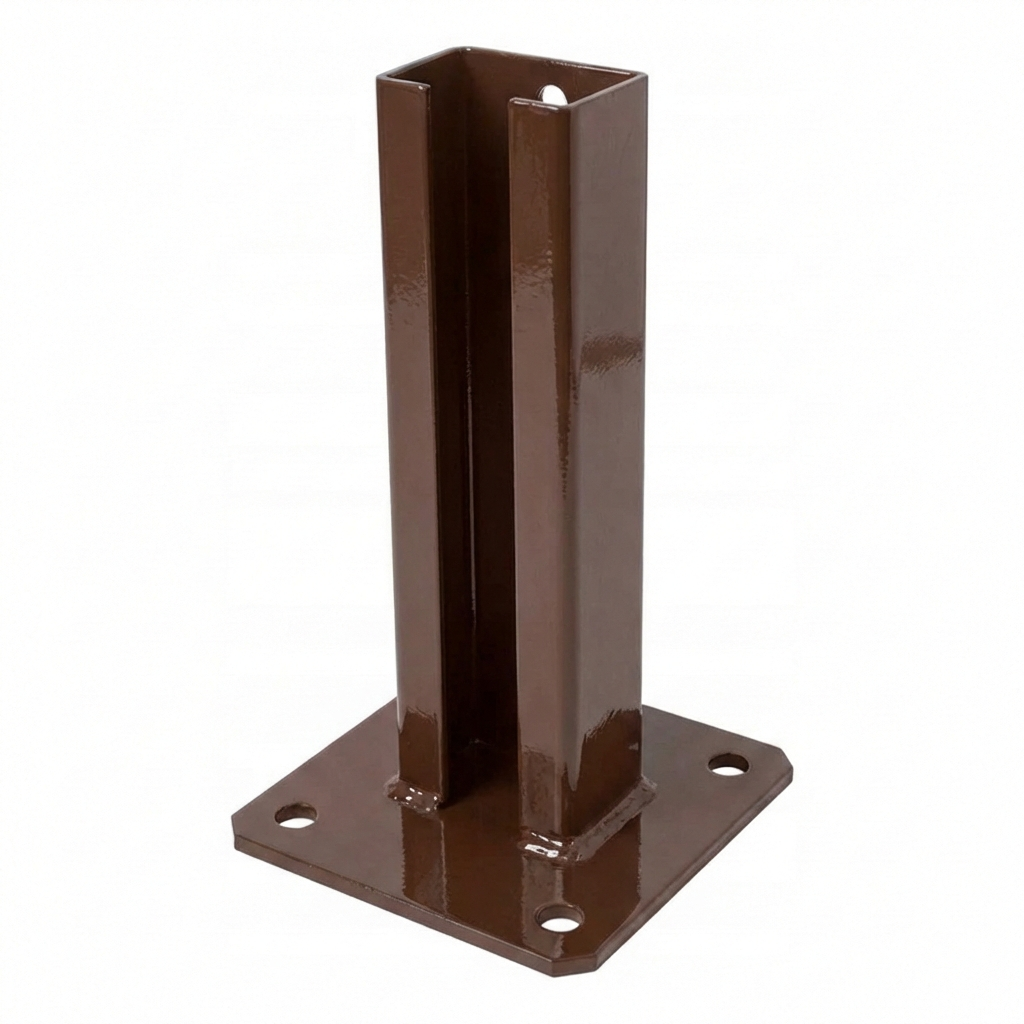 Základňa oplotenia 60×40 mm je odolná oceľová konzola určená na montáž panelových stĺpikov na betónový podklad. Vďaka galvanickému pozinkovaniu a práškovému lakovaniu v hnedej farbe (RAL 8017) produkt zabezpečuje účinnú protikoróznu ochranu a estetický vzhľad — ideálny na vonkajšie použitie.