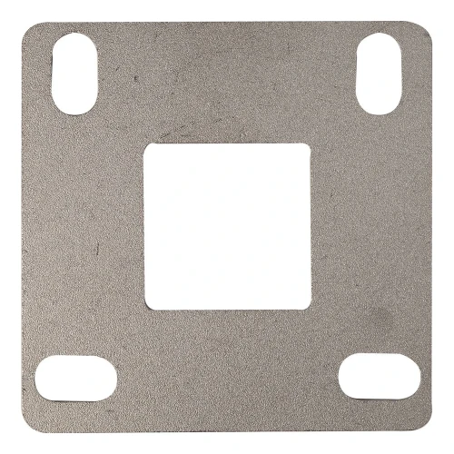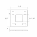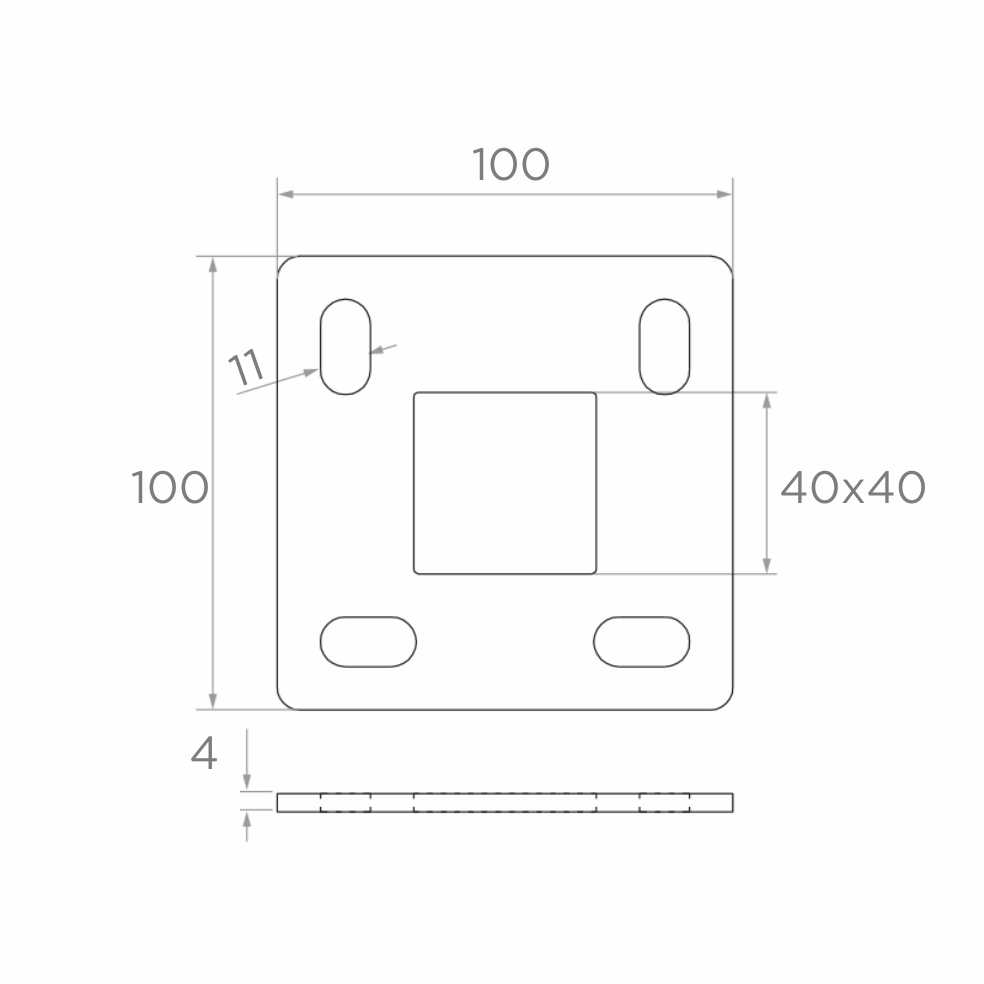 Základňa má centrálny štvorcový otvor 40x40 mm prispôsobený profilu stĺpika a štyri montážne otvory podlhovatého typu (11x20 mm), ktoré umožňujú presnú reguláciu pozície pri priskrutkovaní k podkladu. Surový povrch (bez dodatočnej úpravy) umožňuje zváranie bez nutnosti odstraňovania povlakov — pripravený na prácu ihneď po vybalení z obalu.