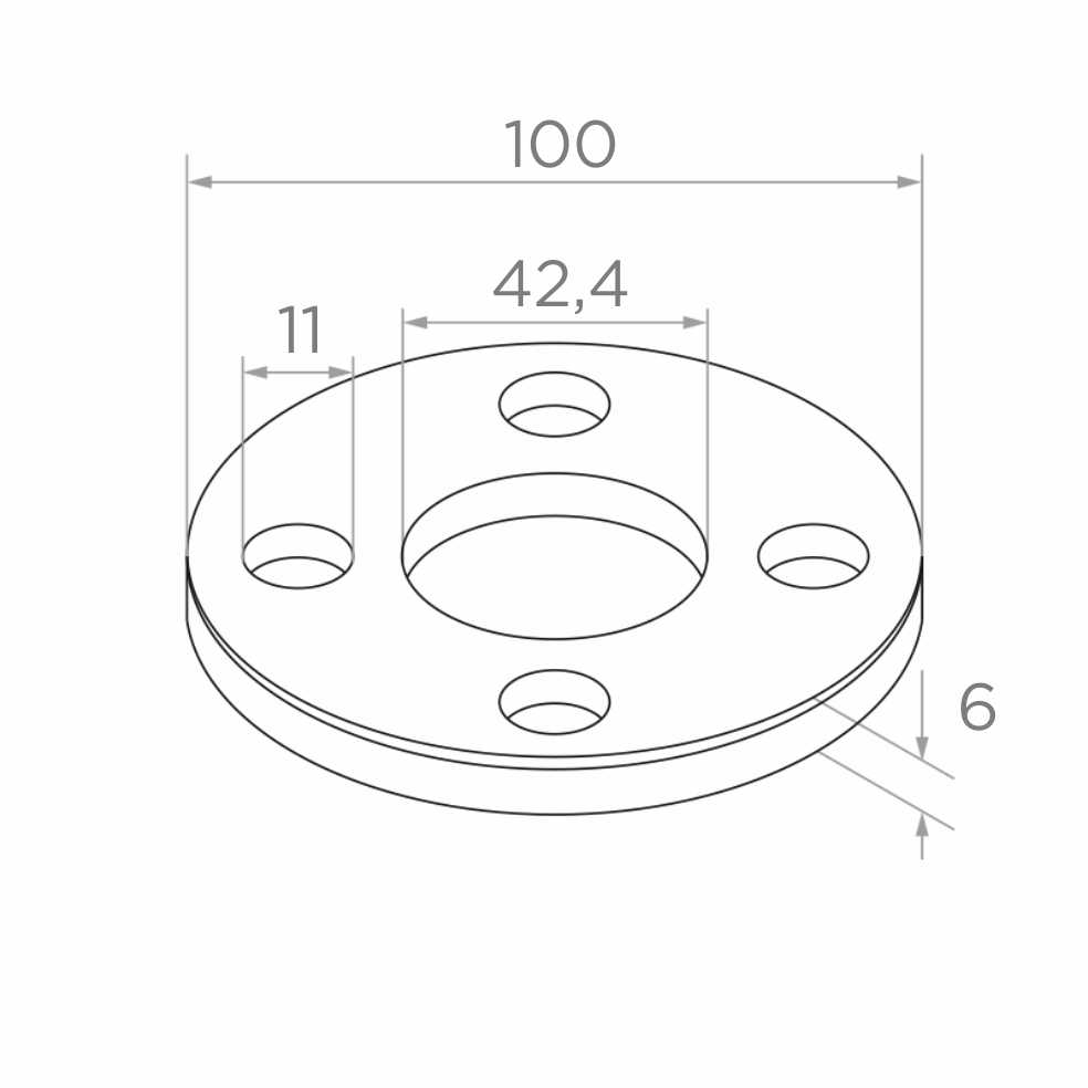 Základňa zábradlového stĺpika je okrúhle upevnenie určené na privarenie stĺpika k podkladu. Konštrukčný prvok zabezpečuje stabilitu a pevnosť celej konštrukcie nerezového zábradlia. Vykonané z nerezovej ocele AISI 304 v saténovom prevedení, zaručuje vysokú odolnosť voči korózii a estetický, jednotný vzhľad v spojení so zostávajúcimi komponentmi zábradlového systému 42,4 mm.