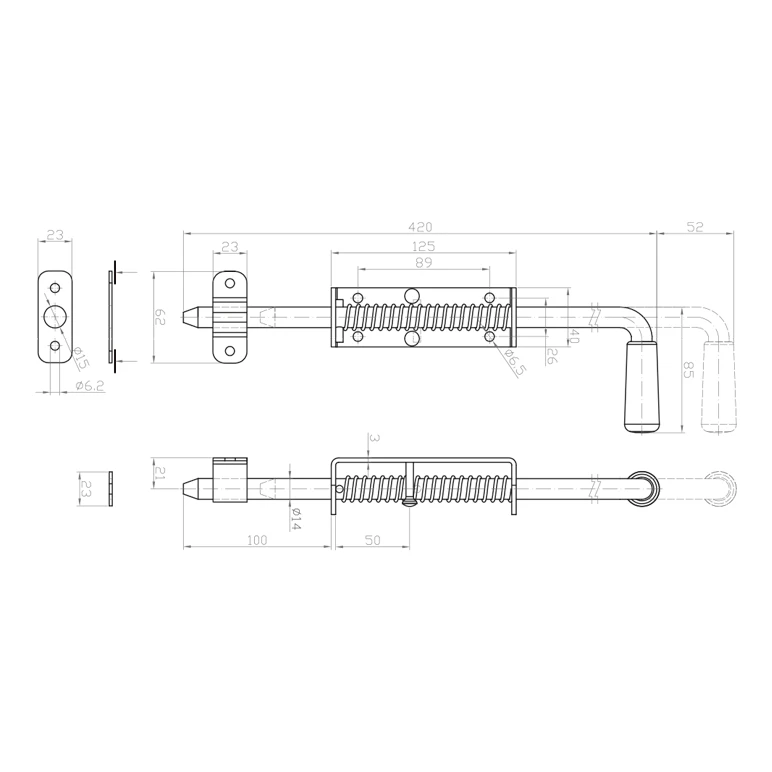 Konštrukcia založená na čape s priemerom ⌀14 mm zabezpečuje vysokú mechanickú odolnosť a stabilné blokovanie krídla brány. Zástrčka sa montuje pomocou skrutiek – v súprave je priložená montážna konzola s otvormi ⌀6,2 mm, ktorá umožňuje rýchlu a spoľahlivú montáž na drevo, oceľ alebo stĺpiky oplotenia. Pozinkovaný povrch chráni pred koróziou, čo zaručuje dlhoročnú prevádzku vonku.