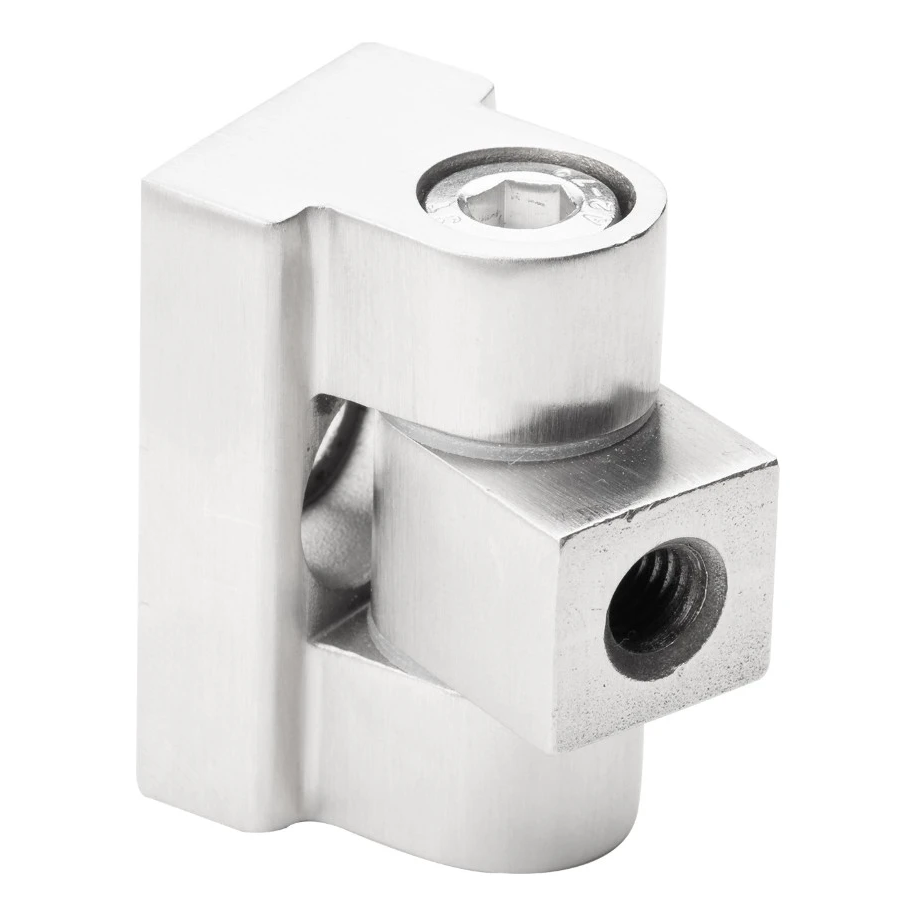 Záves 180° pre úchyt pre sklo z nehrdzavejúcej ocele AISI 304 v saténovom prevedení — prvok určený na profesionálnu montáž sklených konštrukcií v plochom systéme. Umožňuje otvorenie skla v plnom rozsahu 180° (po 90° na každú stranu), čo umožňuje voľné navrhovanie priečok, dverí a sklených kabín bez obmedzení uhla otvorenia.