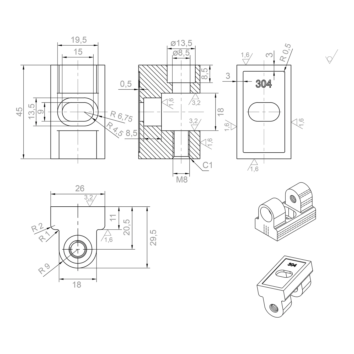 Telo závesu je vyrobené z vysokokvalitnej nehrdzavejúcej ocele AISI 304, čo zaručuje dlhodobú odolnosť proti korózii — aj v prostrediach so zvýšenou vlhkosťou, ako sú kúpeľne, bazény alebo sprchové kabíny. Saténové prevedenie povrchu účinne maskuje stopy prstov a znečistenie, pričom zachováva estetický vzhľad pri minimálnej údržbe. Na technických výkresoch je označená drsnosť povrchu Ra 1,6 a Ra 3,2 — čo potvrdzuje presnú mechanickú obrobku prvkov.