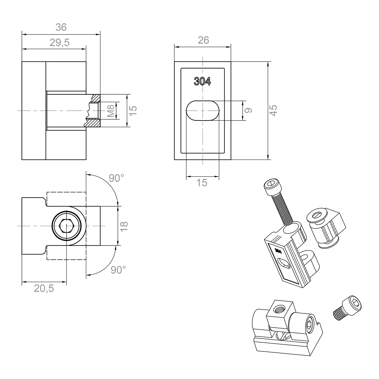 Záves sa montuje na ploché povrchy metódou skrutkovania s využitím závitu M8. Takýto spôsob zabezpečuje vysokú pevnosť spojenia, jednoduchosť inštalácie a prípadnej demontáže — bez potreby použitia špecializovaných nástrojov. Oválny otvor v tele umožňuje nastavenie pozície skla v rozsahu 9 mm, čo uľahčuje presné nastavenie skleného panela počas montáže.